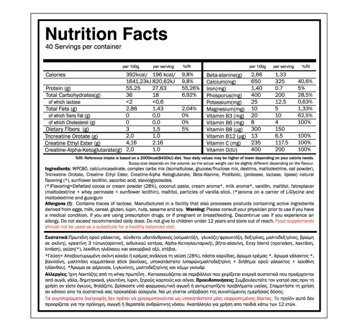 Η παρουσία κρεατίνης τριών μορφών (Ethy Ester HCL, Orotate και AKG) εξασφαλίζει σταδιακή και πλήρη απορρόφηση, ενισχύοντας την αναερόβια δύναμη και την κυτταρική ενέργεια. Τα BCAA και η γλουταμίνη συμβάλλουν στην προστασία του μυϊκού ιστού, περιορίζοντας τον καταβολισμό και βελτιώνοντας την αποκατάσταση. Η Beta-Alanine υποστηρίζει τη διάρκεια και ένταση της προπόνησης, μειώνοντας τη μυϊκή κόπωση, ενώ οι υδατάνθρακες βραδείας αποδέσμευσης, όπως η μαλτοδεξτρίνη και η βρώμη, προσφέρουν παρατεταμένη ενέργεια.