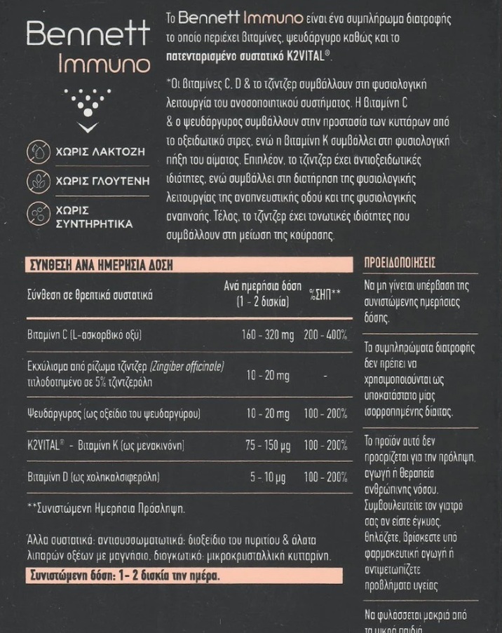 Το Bennett Immuno είναι ένα συμπλήρωμα διατροφής με βιταμίνες, ψευδάργυρο, τζίντζερ και το πατενταρισμένο συστατικό K2VITAL®, σχεδιασμένο για την ενίσχυση του ανοσοποιητικού συστήματος και την προστασία του οργανισμού από το οξειδωτικό στρες.